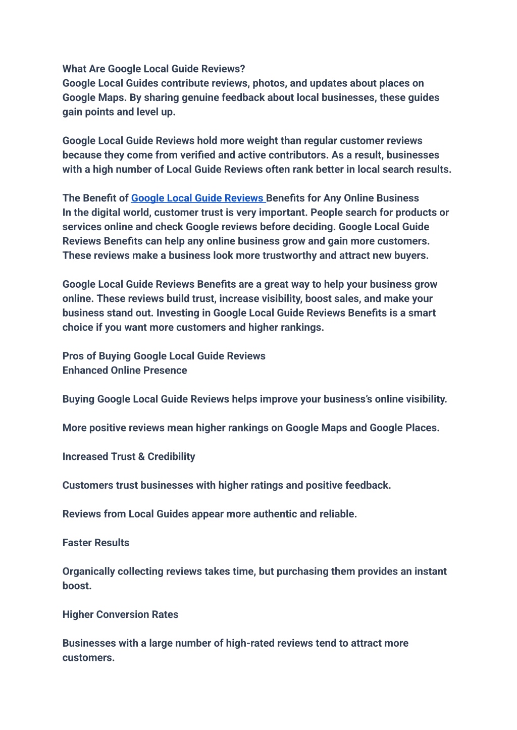 What Are Google Local Guide Reviews? Google Local Guides contribute reviews, photos, and updates about places on Google Maps. By sharing genuine feedback about local businesses, these guides gain points and level up. Google Local Guide Reviews hold more weight than regular customer reviews because they come from verified and active contributors. As a result, businesses with a high number of Local Guide Reviews often rank better in local search results. The Benefit of Google Local Guide Reviews Benefits for Any Online Business In the digital world, customer trust is very important. People search for products or services online and check Google reviews before deciding. Google Local Guide Reviews Benefits can help any online business grow and gain more customers. These reviews make a business look more trustworthy and attract new buyers. Google Local Guide Reviews Benefits are a great way to help your business grow online. These reviews build trust, increase visibility, boost sales, and make your business stand out. Investing in Google Local Guide Reviews Benefits is a smart choice if you want more customers and higher rankings. Pros of Buying Google Local Guide Reviews Enhanced Online Presence Buying Google Local Guide Reviews helps improve your business’s online visibility. More positive reviews mean higher rankings on Google Maps and Google Places. Increased Trust & Credibility Customers trust businesses with higher ratings and positive feedback. Reviews from Local Guides appear more authentic and reliable. Faster Results Organically collecting reviews takes time, but purchasing them provides an instant boost. Higher Conversion Rates Businesses with a large number of high-rated reviews tend to attract more customers.