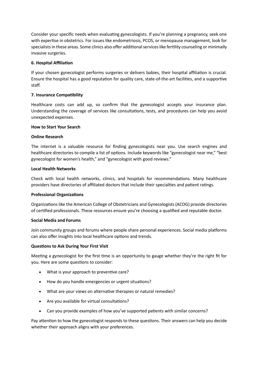 Consider your specific needs when evaluating gynecologists. If you’re planning a pregnancy, seek one with expertise in obstetrics. For issues like endometriosis, PCOS, or menopause management, look for specialists in these areas. Some clinics also offer additional services like fertility counseling or minimally invasive surgeries. 6. Hospital Affiliation If your chosen gynecologist performs surgeries or delivers babies, their hospital affiliation is crucial. Ensure the hospital has a good reputation for quality care, state-of-the-art facilities, and a supportive staff. 7. Insurance Compatibility Healthcare costs can add up, so confirm that the gynecologist accepts your insurance plan. Understanding the coverage of services like consultations, tests, and procedures can help you avoid unexpected expenses. How to Start Your Search Online Research The internet is a valuable resource for finding gynecologists near you. Use search engines and healthcare directories to compile a list of options. Include keywords like “gynecologist near me,” “best gynecologist for women’s health,” and “gynecologist with good reviews.” Local Health Networks Check with local health networks, clinics, and hospitals for recommendations. Many healthcare providers have directories of affiliated doctors that include their specialties and patient ratings. Professional Organizations Organizations like the American College of Obstetricians and Gynecologists (ACOG) provide directories of certified professionals. These resources ensure you’re choosing a qualified and reputable doctor. Social Media and Forums Join community groups and forums where people share personal experiences. Social media platforms can also offer insights into local healthcare options and trends. Questions to Ask During Your First Visit Meeting a gynecologist for the first time is an opportunity to gauge whether they’re the right fit for you. Here are some questions to consider: • What is your approach to preventive care? • How do you handle emergencies or urgent situations? • What are your views on alternative therapies or natural remedies? • Are you available for virtual consultations? • Can you provide examples of how you’ve supported patients with similar concerns? Pay attention to how the gynecologist responds to these questions. Their answers can help you decide whether their approach aligns with your preferences.