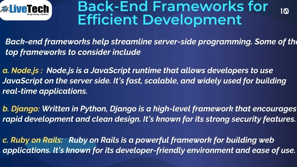 Back-End Frameworks for Efficient Development 10 Back-end frameworks help streamline server-side programming. Some of the top frameworks to consider include a. Node.js : Node.js is a JavaScript runtime that allows developers to use JavaScript on the server side. It’s fast, scalable, and widely used for building real-time applications. b. Django: Written in Python, Django is a high-level framework that encourages rapid development and clean design. It’s known for its strong security features. c. Ruby on Rails: Ruby on Rails is a powerful framework for building web applications. It’s known for its developer-friendly environment and ease of use.