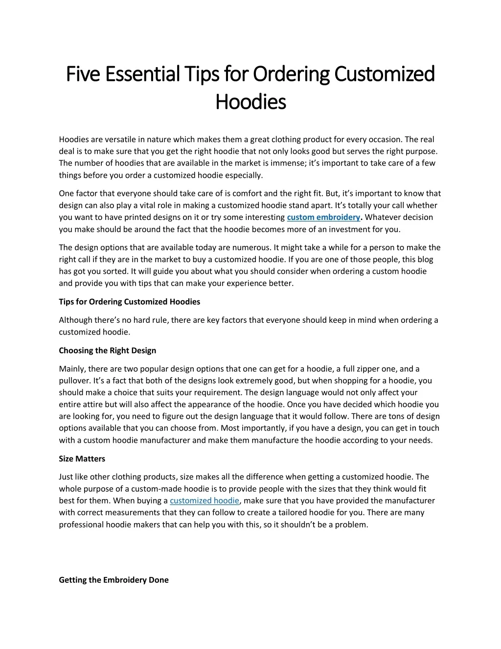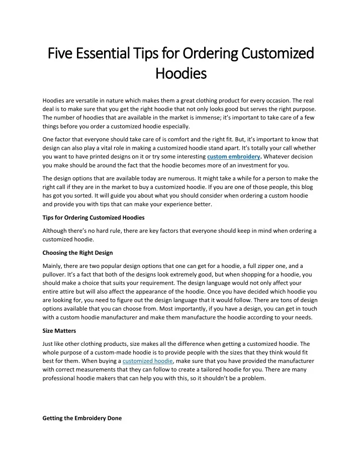 Five Essential Tips for Ordering Customized Five Essential Tips for Ordering Customized Hoodies Hoodies Hoodies are versatile in nature which makes them a great clothing product for every occasion. The real deal is to make sure that you get the right hoodie that not only looks good but serves the right purpose. The number of hoodies that are available in the market is immense; it’s important to take care of a few things before you order a customized hoodie especially. One factor that everyone should take care of is comfort and the right fit. But, it’s important to know that design can also play a vital role in making a customized hoodie stand apart. It’s totally your call whether you want to have printed designs on it or try some interesting custom embroidery. Whatever decision you make should be around the fact that the hoodie becomes more of an investment for you. The design options that are available today are numerous. It might take a while for a person to make the right call if they are in the market to buy a customized hoodie. If you are one of those people, this blog has got you sorted. It will guide you about what you should consider when ordering a custom hoodie and provide you with tips that can make your experience better. Tips for Ordering Customized Hoodies Although there’s no hard rule, there are key factors that everyone should keep in mind when ordering a customized hoodie. Choosing the Right Design Mainly, there are two popular design options that one can get for a hoodie, a full zipper one, and a pullover. It’s a fact that both of the designs look extremely good, but when shopping for a hoodie, you should make a choice that suits your requirement. The design language would not only affect your entire attire but will also affect the appearance of the hoodie. Once you have decided which hoodie you are looking for, you need to figure out the design language that it would follow. There are tons of design options available that you can choose from. Most importantly, if you have a design, you can get in touch with a custom hoodie manufacturer and make them manufacture the hoodie according to your needs. Size Matters Just like other clothing products, size makes all the difference when getting a customized hoodie. The whole purpose of a custom-made hoodie is to provide people with the sizes that they think would fit best for them. When buying a customized hoodie, make sure that you have provided the manufacturer with correct measurements that they can follow to create a tailored hoodie for you. There are many professional hoodie makers that can help you with this, so it shouldn’t be a problem. Getting the Embroidery Done