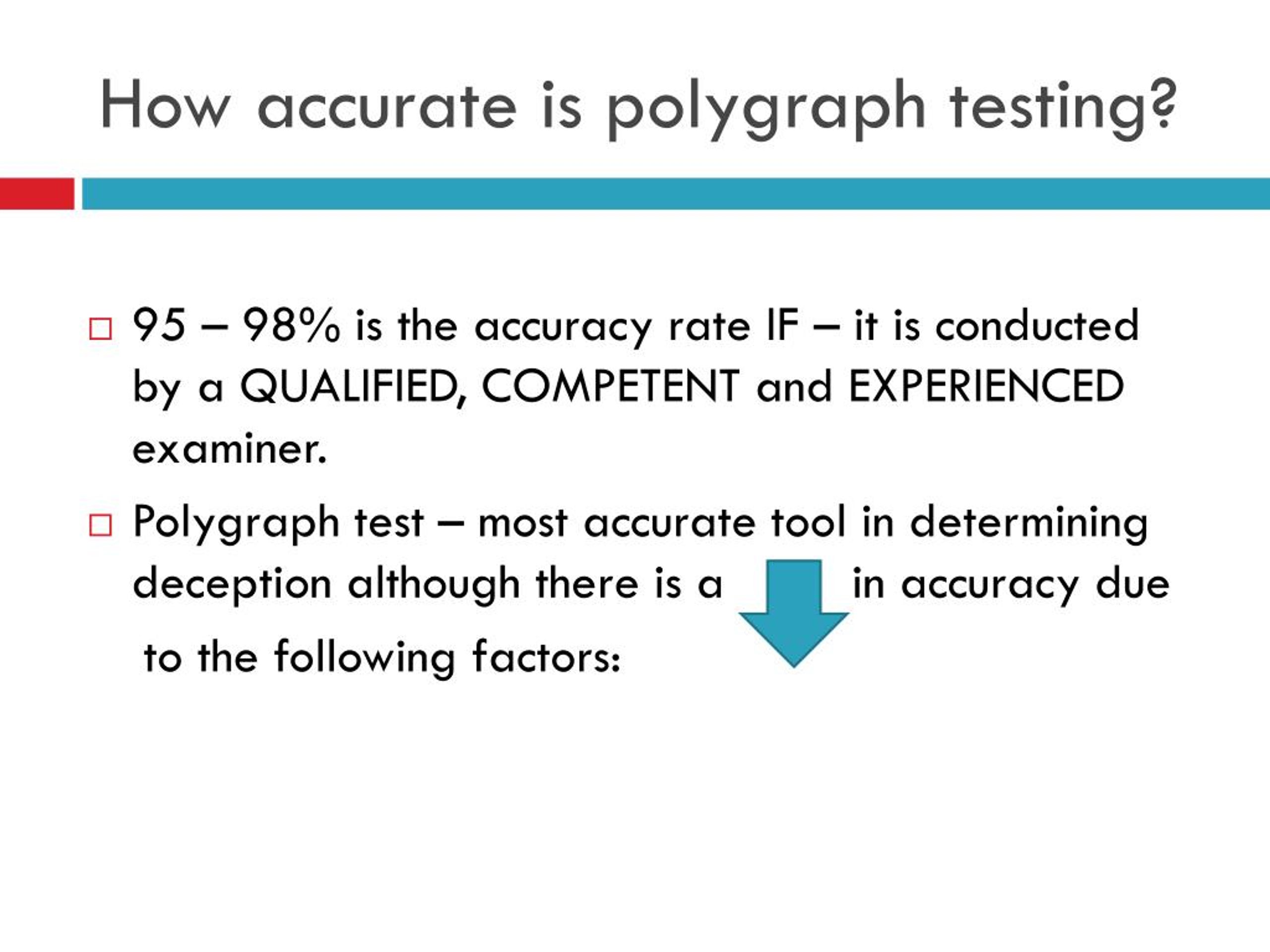 How accurate is polygraph testing? • 95 – 98% is the accuracy rate IF – it is conducted by a QUALIFIED, COMPETENT and EXPERIENCED examiner. • Polygraph test – most accurate tool in determining deception although there is a in accuracy due to the following factors: