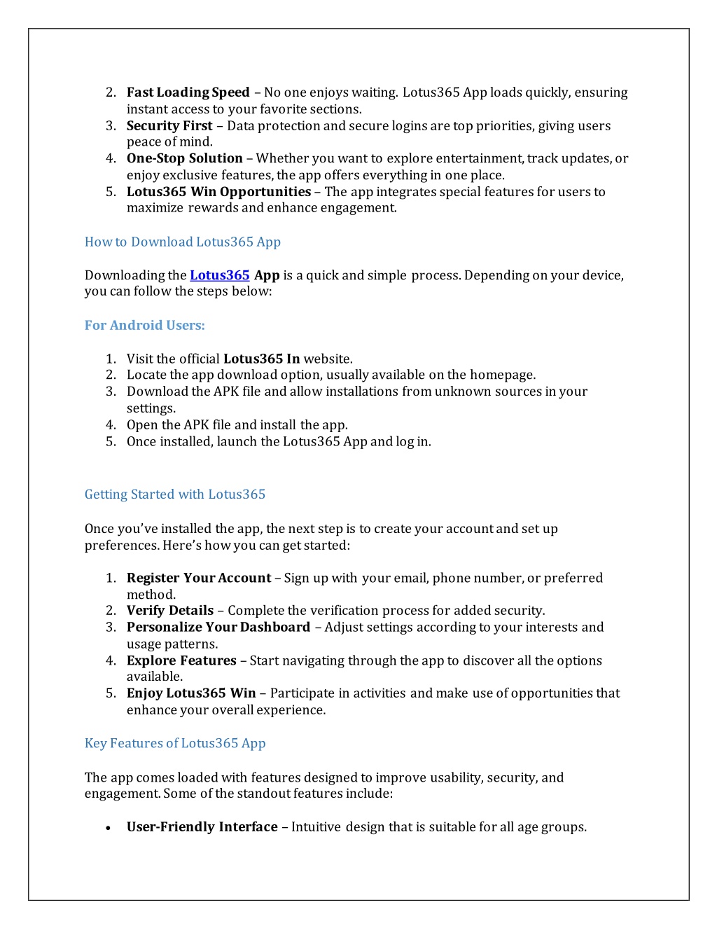 2.Fast Loading Speed– No one enjoys waiting. Lotus365 App loads quickly, ensuring instant access to your favorite sections. 3.Security First– Data protection and secure logins are top priorities, giving users peace of mind. 4.One-Stop Solution– Whether you want to explore entertainment, track updates, or enjoy exclusive features, the app offers everything in one place. 5.Lotus365 Win Opportunities– The app integrates special features for users to maximize rewards and enhance engagement. How to Download Lotus365 App Downloading the Lotus365 App is a quick and simple process. Depending on your device, you can follow the steps below: For Android Users: 1.Visit the official Lotus365 In website. 2.Locate the app download option, usually available on the homepage. 3.Download the APK file and allow installations from unknown sources in your settings. 4.Open the APK file and install the app. 5.Once installed, launch the Lotus365 App and log in. Getting Started with Lotus365 Once you’ve installed the app, the next step is to create your account and set up preferences. Here’s how you can get started: 1.Register Your Account– Sign up with your email, phone number, or preferred method. 2.Verify Details– Complete the verification process for added security. 3.Personalize Your Dashboard– Adjust settings according to your interests and usage patterns. 4.Explore Features– Start navigating through the app to discover all the options available. 5.Enjoy Lotus365 Win– Participate in activities and make use of opportunities that enhance your overall experience. Key Features of Lotus365 App The app comes loaded with features designed to improve usability, security, and engagement. Some of the standout features include: User-Friendly Interface– Intuitive design that is suitable for all age groups.