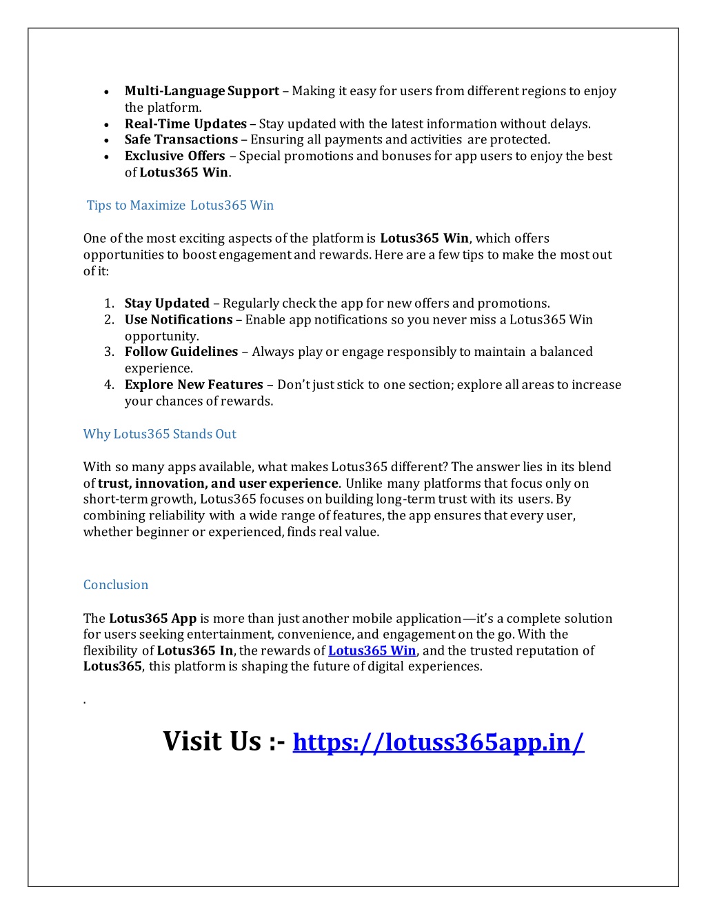 Multi-Language Support– Making it easy for users from different regions to enjoy the platform. Real-Time Updates– Stay updated with the latest information without delays. Safe Transactions– Ensuring all payments and activities are protected. Exclusive Offers– Special promotions and bonuses for app users to enjoy the best of Lotus365 Win. Tips to Maximize Lotus365 Win One of the most exciting aspects of the platform is Lotus365 Win, which offers opportunities to boost engagement and rewards. Here are a few tips to make the most out of it: 1.Stay Updated– Regularly check the app for new offers and promotions. 2.Use Notifications– Enable app notifications so you never miss a Lotus365 Win opportunity. 3.Follow Guidelines– Always play or engage responsibly to maintain a balanced experience. 4.Explore New Features–Don’t just stick to one section; explore all areas to increase your chances of rewards. Why Lotus365 Stands Out With so many apps available, what makes Lotus365 different? The answer lies in its blend of trust, innovation, and user experience. Unlike many platforms that focus only on short-term growth, Lotus365 focuses on building long-term trust with its users. By combining reliability with a wide range of features, the app ensures that every user, whether beginner or experienced, finds real value. Conclusion The Lotus365 App is more than just another mobile application—it’s a complete solution for users seeking entertainment, convenience, and engagement on the go. With the flexibility of Lotus365 In, the rewards of Lotus365 Win, and the trusted reputation of Lotus365, this platform is shaping the future of digital experiences. . Visit Us :- https://lotuss365app.in/