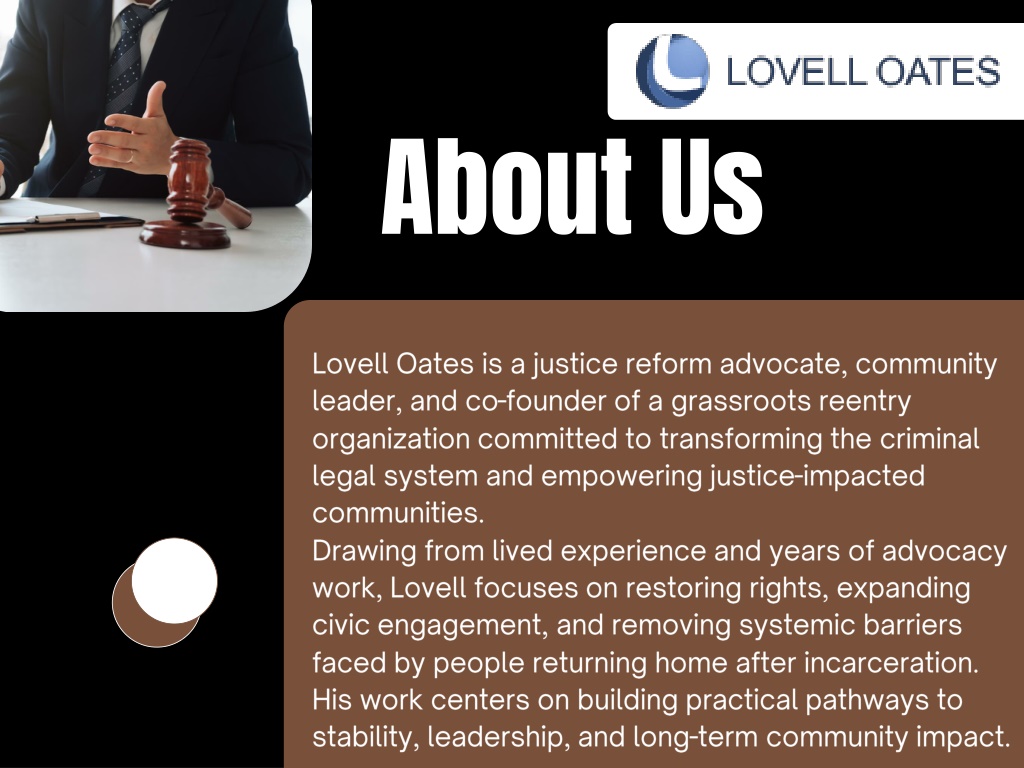 About Us Lovell Oates is a justice reform advocate, community leader, and co-founder of a grassroots reentry organization committed to transforming the criminal legal system and empowering justice-impacted communities. Drawing from lived experience and years of advocacy work, Lovell focuses on restoring rights, expanding civic engagement, and removing systemic barriers faced by people returning home after incarceration. His work centers on building practical pathways to stability, leadership, and long-term community impact.