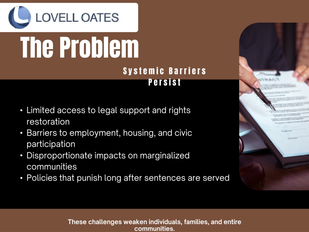 The Problem Systemic Barriers Persist • Limited access to legal support and rights restoration • Barriers to employment, housing, and civic participation • Disproportionate impacts on marginalized communities • Policies that punish long after sentences are served These challenges weaken individuals, families, and entire communities.