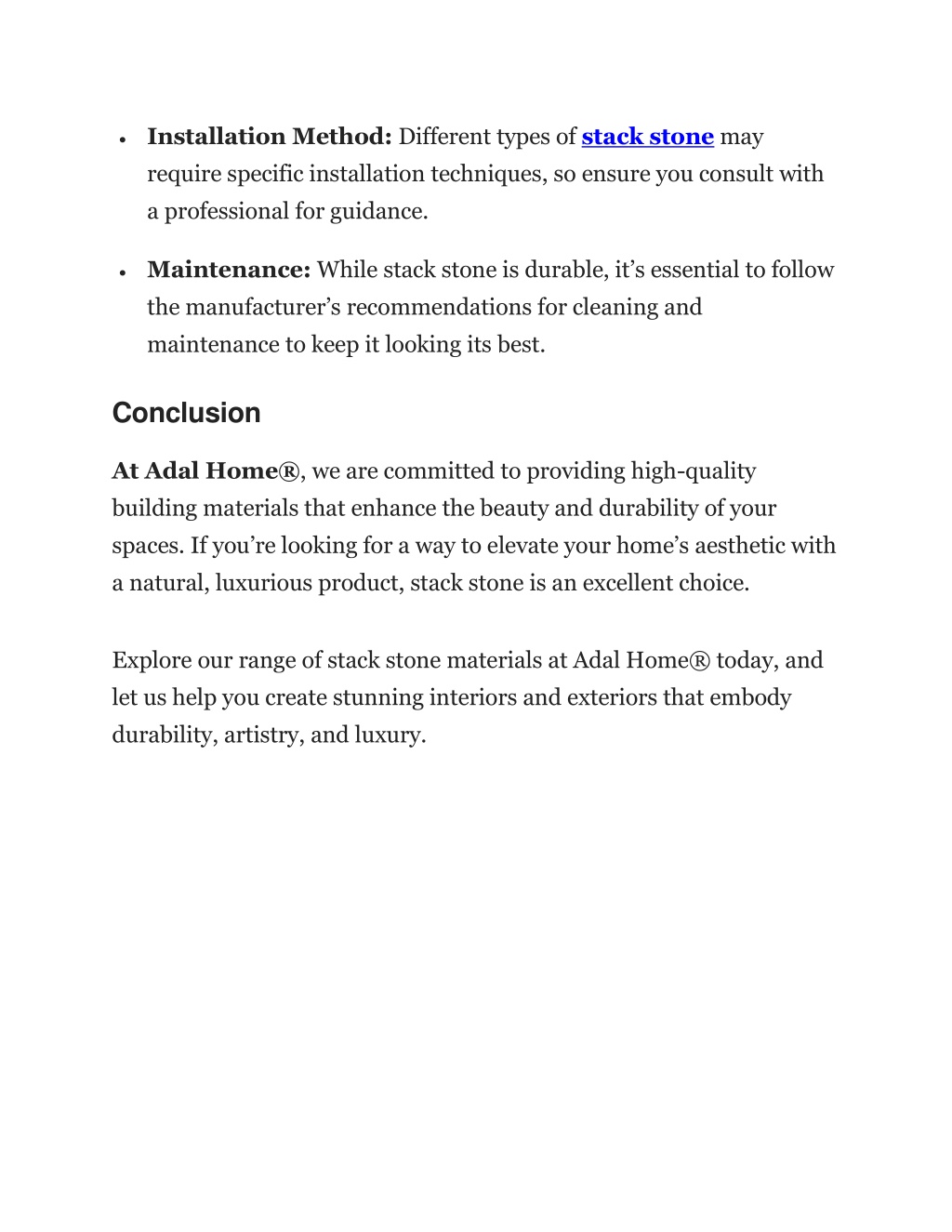 Installation Method: Different types of stack stone may require specific installation techniques, so ensure you consult with a professional for guidance. Maintenance:While stack stone is durable, it’s essential to follow the manufacturer’s recommendations for cleaning and maintenance to keep it looking its best. Conclusion At Adal Home®, we are committed to providing high-quality building materials that enhance the beauty and durability of your spaces. If you’re looking for a way to elevate your home’s aesthetic with a natural, luxurious product, stack stone is an excellent choice. Explore our range of stack stone materials at Adal Home® today, and let us help you create stunning interiors and exteriors that embody durability, artistry, and luxury.