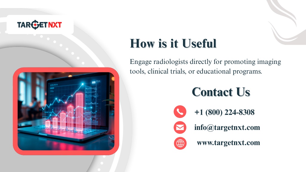 How is it Useful How is it Useful Engage radiologists directly for promoting imaging tools, clinical trials, or educational programs. Contact Us Contact Us +1 (800) 224-8308 info@targetnxt.com www.targetnxt.com