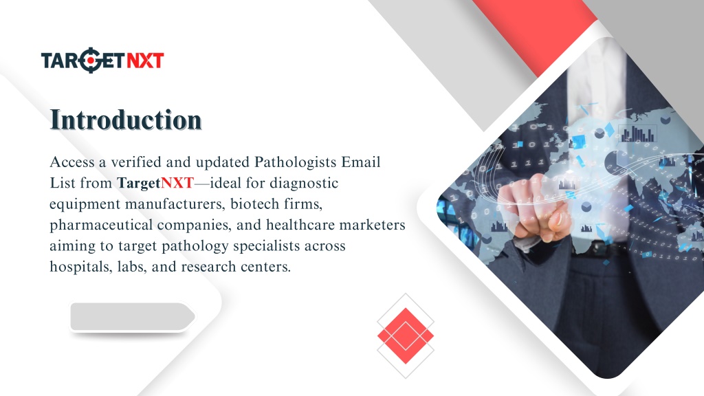 Introduction Introduction Access a verified and updated Pathologists Email List from TargetNXT—ideal for diagnostic equipment manufacturers, biotech firms, pharmaceutical companies, and healthcare marketers aiming to target pathology specialists across hospitals, labs, and research centers.