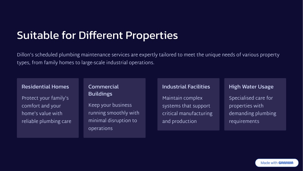 Suitable for Different Properties Dillon's scheduled plumbing maintenance services are expertly tailored to meet the unique needs of various property types, from family homes to large-scale industrial operations. Residential Homes Commercial Buildings Industrial Facilities High Water Usage Protect your family's comfort and your home's value with reliable plumbing care Maintain complex systems that support critical manufacturing and production Specialised care for properties with demanding plumbing requirements Keep your business running smoothly with minimal disruption to operations