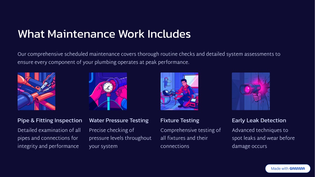 What Maintenance Work Includes Our comprehensive scheduled maintenance covers thorough routine checks and detailed system assessments to ensure every component of your plumbing operates at peak performance. Pipe & Fitting Inspection Detailed examination of all pipes and connections for integrity and performance Water Pressure Testing Precise checking of pressure levels throughout your system Fixture Testing Comprehensive testing of all fixtures and their connections Early Leak Detection Advanced techniques to spot leaks and wear before damage occurs