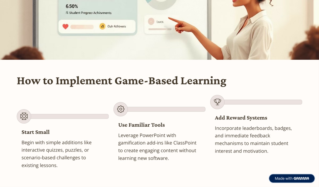 How to Implement Game-Based Learning Add Reward Systems Use Familiar Tools Incorporate leaderboards, badges, and immediate feedback mechanisms to maintain student interest and motivation. Start Small Leverage PowerPoint with gamification add-ins like ClassPoint to create engaging content without learning new software. Begin with simple additions like interactive quizzes, puzzles, or scenario-based challenges to existing lessons.