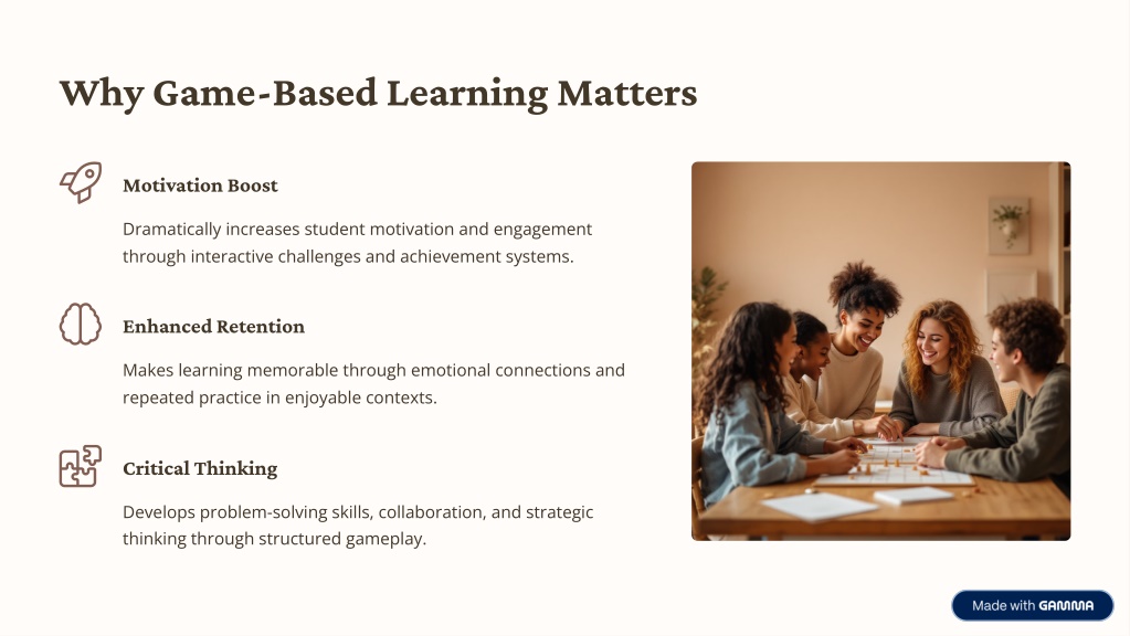 Why Game-Based Learning Matters Motivation Boost Dramatically increases student motivation and engagement through interactive challenges and achievement systems. Enhanced Retention Makes learning memorable through emotional connections and repeated practice in enjoyable contexts. Critical Thinking Develops problem-solving skills, collaboration, and strategic thinking through structured gameplay.