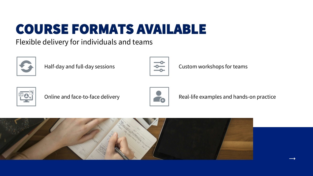 COURSE FORMATS AVAILABLE COURSE FORMATS AVAILABLE Flexible delivery for individuals and teams Half-day and full-day sessions Custom workshops for teams Online and face-to-face delivery Real-life examples and hands-on practice