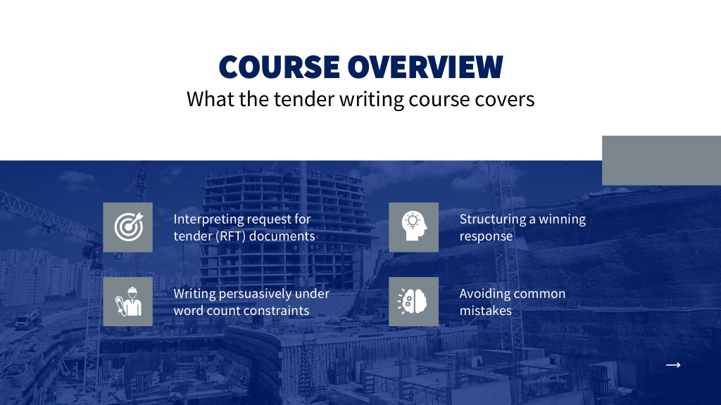 COURSE OVERVIEW COURSE OVERVIEW What the tender writing course covers Interpreting request for tender (RFT) documents Structuring a winning response Writing persuasively under word count constraints Avoiding common mistakes