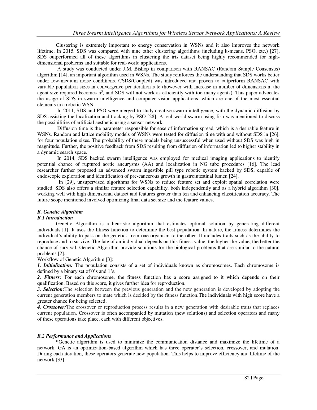 Three Swarm Intelligence Algorithms for Wireless Sensor Network Applications: A Review lifetime. In 2015, SDS was compared with nine other clustering algorithms (including k-means, PSO, etc.) [27]. SDS outperformed all of these algorithms in clustering the iris dataset being highly recommended for high- dimensional problems and suitable for real-world applications. A study was conducted under J.M. Bishop in comparison with RANSAC (Random Sample Consensus) algorithm [14], an important algorithm used in WSNs. The study reinforces the understanding that SDS works better under low-medium noise conditions. CSDS(Coupled) was introduced and proven to outperform RANSAC with variable population sizes in convergence per iteration rate (however with increase in number of dimensions n, the agent size required becomes n3, and SDS will not work as efficiently with too many agents). This paper advocates the usage of SDS in swarm intelligence and computer vision applications, which are one of the most essential elements in a robotic WSN. In 2011, SDS and PSO were merged to study creative swarm intelligence, with the dynamic diffusion by SDS assisting the localization and tracking by PSO [28]. A real-world swarm using fish was mentioned to discuss the possibilities of artificial aesthetic using a sensor network. Diffusion time is the parameter responsible for ease of information spread, which is a desirable feature in WSNs. Random and lattice mobility models of WSNs were tested for diffusion time with and without SDS in [26], for four population sizes. The probability of these models being unsuccessful when used without SDS was high in magnitude. Further, the positive feedback from SDS resulting from diffusion of information led to higher stability in a dynamic search space. In 2014, SDS backed swarm intelligence was employed for medical imaging applications to identify potential chance of ruptured aortic aneurysms (AA) and localization in NG tube procedures [16]. The lead researcher further proposed an advanced swarm ingestible pill type robotic system backed by SDS, capable of endoscopic exploration and identification of pre-cancerous growth in gastrointestinal lumen [24]. In [29], unsupervised algorithms for WSNs to reduce feature set and exploit spatial correlation were studied. SDS also offers a similar feature selection capability, both independently and as a hybrid algorithm [30], working well with high dimensional dataset and features greater than ten and enhancing classification accuracy. The future scope mentioned involved optimizing final data set size and the feature values. B. Genetic Algorithm B.1 Introduction Genetic Algorithm is a heuristic algorithm that estimates optimal solution by generating different individuals [1]. It uses the fitness function to determine the best population. In nature, the fitness determines the individual’s ability to pass on the genetics from one organism to the other. It includes traits such as the ability to reproduce and to survive. The fate of an individual depends on this fitness value, the higher the value, the better the chance of survival. Genetic Algorithm provide solutions for the biological problems that are similar to the natural problems [2]. Workflow of Genetic Algorithm [3]: 1. Initialization: The population consists of a set of individuals known as chromosomes. Each chromosome is defined by a binary set of 0’s and 1’s. 2. Fitness: For each chromosome, the fitness function has a score assigned to it which depends on their qualification. Based on this score, it gives further idea for reproduction. 3. Selection:The selection between the previous generation and the new generation is developed by adopting the current generation members to mate which is decided by the fitness function.The individuals with high score have a greater chance for being selected. 4. Crossover:The crossover or reproduction process results in a new generation with desirable traits that replaces current population. Crossover is often accompanied by mutation (new solutions) and selection operators and many of these operations take place, each with different objectives. Clustering is extremely important to energy conservation in WSNs and it also improves the network B.2 Performance and Applications *Genetic algorithm is used to minimize the communication distance and maximize the lifetime of a network. GA is an optimization-based algorithm which has three operator’s selection, crossover, and mutation. During each iteration, these operators generate new population. This helps to improve efficiency and lifetime of the network [33]. 82 | Page