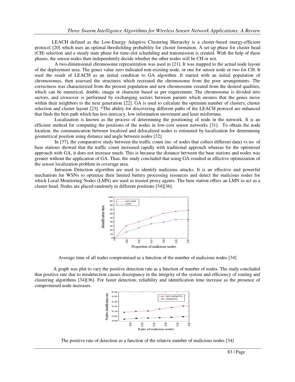 Three Swarm Intelligence Algorithms for Wireless Sensor Network Applications: A Review protocol [20] which uses an optimal thresholding probability for cluster formation. A set-up phase for cluster head (CH) selection and a steady state phase for time-slot scheduling and transmission is created. With the help of these phases, the sensor nodes then independently decide whether the other nodes will be CH or not. A two-dimensional chromosome representation was used in [21]. It was mapped to the actual node layout of the deployment area. The genes value zero indicated non-existing node, or one for sensor node or two for CH. It used the result of LEACH as an initial condition to GA algorithm. It started with an initial population of chromosomes, then assessed the structures which recreated the chromosome from the poor arrangements. The correctness was characterized from the present population and new chromosome created from the desired qualities, which can be numerical, double, image or character based as per requirement. The chromosome is divided into sectors, and crossover is performed by exchanging sectors between parents which ensures that the genes move within their neighbors to the next generation [22]. GA is used to calculate the optimum number of clusters, cluster selection and cluster layout [23]. *The ability for discovering different paths of the LEACH protocol are enhanced that finds the best path which has less intricacy, low information movement and least misfortune. Localization is known as the process of determining the positioning of node in the network. It is an efficient method for computing the positions of the nodes in low-cost sensor networks [31]. To obtain the node location, the communication between localized and delocalized nodes is estimated by localization for determining geometrical position using distance and angle between nodes [32]. In [37], the comparative study between the traffic count (no. of nodes that collect different data) vs no. of base stations showed that the traffic count increased rapidly with traditional approach whereas for the optimized approach with GA, it does not increase much. This is because the distance between the base stations and nodes was greater without the application of GA. Thus, the study concluded that using GA resulted in effective optimization of the sensor localization problem in coverage area. Intrusion Detection algorithm are used to identify malicious attacks. It is an effective and powerful mechanism for WSNs to optimize their limited battery processing resources and detect the malicious nodes for which Local Monitoring Nodes (LMN) are used as trusted proxy agents. The base station offers an LMN to act as a cluster head. Nodes are placed randomly in different positions [34][36]. LEACH defined as the Low-Energy Adaptive Clustering Hierarchy is a cluster-based energy-efficient Average time of all nodes compromised as a function of the number of malicious nodes [34] that positive rate due to misdetection causes discrepancy in the integrity of the system and efficiency of routing and clustering algorithms [34][36]. For faster detection, reliability and identification time increase as the presence of compromised node increases. A graph was plot to vary the positive detection rate as a function of number of nodes. The study concluded The positive rate of detection as a function of the relative number of malicious nodes [34] 83 | Page