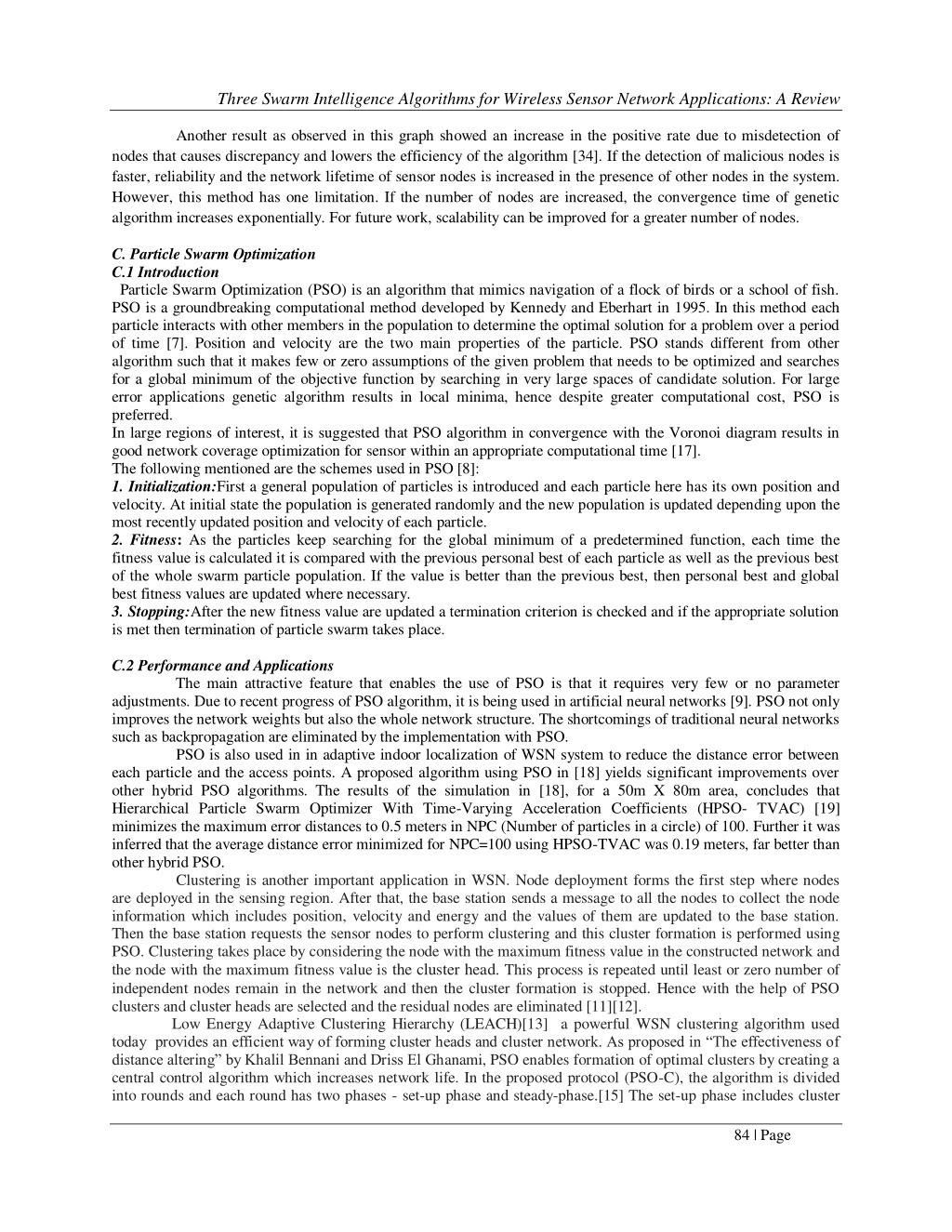 Three Swarm Intelligence Algorithms for Wireless Sensor Network Applications: A Review Another result as observed in this graph showed an increase in the positive rate due to misdetection of nodes that causes discrepancy and lowers the efficiency of the algorithm [34]. If the detection of malicious nodes is faster, reliability and the network lifetime of sensor nodes is increased in the presence of other nodes in the system. However, this method has one limitation. If the number of nodes are increased, the convergence time of genetic algorithm increases exponentially. For future work, scalability can be improved for a greater number of nodes. C. Particle Swarm Optimization C.1 Introduction Particle Swarm Optimization (PSO) is an algorithm that mimics navigation of a flock of birds or a school of fish. PSO is a groundbreaking computational method developed by Kennedy and Eberhart in 1995. In this method each particle interacts with other members in the population to determine the optimal solution for a problem over a period of time [7]. Position and velocity are the two main properties of the particle. PSO stands different from other algorithm such that it makes few or zero assumptions of the given problem that needs to be optimized and searches for a global minimum of the objective function by searching in very large spaces of candidate solution. For large error applications genetic algorithm results in local minima, hence despite greater computational cost, PSO is preferred. In large regions of interest, it is suggested that PSO algorithm in convergence with the Voronoi diagram results in good network coverage optimization for sensor within an appropriate computational time [17]. The following mentioned are the schemes used in PSO [8]: 1. Initialization:First a general population of particles is introduced and each particle here has its own position and velocity. At initial state the population is generated randomly and the new population is updated depending upon the most recently updated position and velocity of each particle. 2. Fitness: As the particles keep searching for the global minimum of a predetermined function, each time the fitness value is calculated it is compared with the previous personal best of each particle as well as the previous best of the whole swarm particle population. If the value is better than the previous best, then personal best and global best fitness values are updated where necessary. 3. Stopping:After the new fitness value are updated a termination criterion is checked and if the appropriate solution is met then termination of particle swarm takes place. C.2 Performance and Applications The main attractive feature that enables the use of PSO is that it requires very few or no parameter adjustments. Due to recent progress of PSO algorithm, it is being used in artificial neural networks [9]. PSO not only improves the network weights but also the whole network structure. The shortcomings of traditional neural networks such as backpropagation are eliminated by the implementation with PSO. PSO is also used in in adaptive indoor localization of WSN system to reduce the distance error between each particle and the access points. A proposed algorithm using PSO in [18] yields significant improvements over other hybrid PSO algorithms. The results of the simulation in [18], for a 50m X 80m area, concludes that Hierarchical Particle Swarm Optimizer With Time-Varying Acceleration Coefficients (HPSO- TVAC) [19] minimizes the maximum error distances to 0.5 meters in NPC (Number of particles in a circle) of 100. Further it was inferred that the average distance error minimized for NPC=100 using HPSO-TVAC was 0.19 meters, far better than other hybrid PSO. Clustering is another important application in WSN. Node deployment forms the first step where nodes are deployed in the sensing region. After that, the base station sends a message to all the nodes to collect the node information which includes position, velocity and energy and the values of them are updated to the base station. Then the base station requests the sensor nodes to perform clustering and this cluster formation is performed using PSO. Clustering takes place by considering the node with the maximum fitness value in the constructed network and the node with the maximum fitness value is the cluster head. This process is repeated until least or zero number of independent nodes remain in the network and then the cluster formation is stopped. Hence with the help of PSO clusters and cluster heads are selected and the residual nodes are eliminated [11][12]. Low Energy Adaptive Clustering Hierarchy (LEACH)[13] a powerful WSN clustering algorithm used today provides an efficient way of forming cluster heads and cluster network. As proposed in “The effectiveness of distance altering” by Khalil Bennani and Driss El Ghanami, PSO enables formation of optimal clusters by creating a central control algorithm which increases network life. In the proposed protocol (PSO-C), the algorithm is divided into rounds and each round has two phases - set-up phase and steady-phase.[15] The set-up phase includes cluster 84 | Page