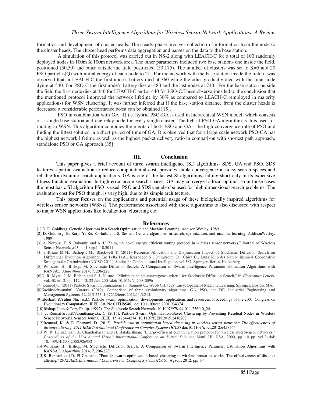 Three Swarm Intelligence Algorithms for Wireless Sensor Network Applications: A Review formation and development of cluster heads. The steady-phase involves collection of information from the node to the cluster heads. The cluster head performs data aggregation and passes on the data to the base station. A simulation of this protocol was carried out in NS-2 along with LEACH-C for a total of 100 randomly deployed nodes in 100m X 100m network area. The other parameters included two base station- one inside the field, positioned (50,50) and other outside the field positioned (50,175). The number of clusters was set to K=5 and 20 PSO particles(Q) with initial energy of each node to 2J. For the network with the base station inside the field it was observed that in LEACH-C the first node’s battery died at 360 while the other gradually died with the final node dying at 540. For PSO-C the first node’s battery dies at 480 and the last nodes at 740. For the base station outside the field the first node dies at 340 for LEACH-C and at 440 for PSO-C.These observations led to the conclusion that the mentioned protocol improved the network lifetime by 30% as compared to LEACH-C (employed in majority applications) for WSN clustering. It was further inferred that if the base station distance from the cluster heads is decreased a considerable performance boost can be obtained [15]. PSO in combination with GA [1] i.e. hybrid PSO-GA is used in hierarchical WSN model, which consists of a single base station and one relay node for every single cluster. The hybrid PSO-GA algorithm is thus used for routing in WSN. This algorithm combines the merits of both PSO and GA - the high convergence rate of PSO and finding the fittest solution in a short period of time of GA. It is observed that for a large-scale network PSO-GA has the highest network lifetime as well as the highest packet delivery ratio in comparison with shortest path approach, standalone PSO or GA approach.[35] III. This paper gives a brief account of three swarm intelligence (SI) algorithms- SDS, GA and PSO. SDS features a partial evaluation to reduce computational cost, provides stable convergence in noisy search spaces and reliable for dynamic search applications. GA is one of the fastest SI algorithms, falling short only in its expensive fitness function evaluation. In high error prone search spaces, GA may converge to local optima, so in those cases the most basic SI algorithm PSO is used. PSO and SDS can also be used for high dimensional search problems. The evaluation cost for PSO though, is very high, due to its simple architecture. This paper focuses on the applications and potential usage of these biologically inspired algorithms for wireless sensor networks (WSNs). The performance associated with these algorithms is also discussed with respect to major WSN applications like localization, clustering etc. References [1] D. E. Goldberg, Genetic Algorithm in a Search Optimization and Machine Learning, Addison Wesley, 1989. [2] D. Goldberg, B. Karp, Y. Ke, S. Nath, and S. Seshan, Genetic algorithms in search, optimization, and machine learning. AddisonWesley, 1989 [3] A. Norouzi, F. S. Babamir, and A. H. Zaim, “A novel energy efficient routing protocol in wireless sensor networks,” Journal of Wireless Sensor Network,vol3.,no.10,pp.1–10,2011 [4] al-Rifaie M.M., Bishop J.M., Blackwell T. (2011) Resource Allocation and Dispensation Impact of Stochastic Diffusion Search on Differential Evolution Algorithm. In: Pelta D.A., Krasnogor N., Dumitrescu D., Chira C., Lung R. (eds) Nature Inspired Cooperative Strategies for Optimization (NICSO 2011). Studies in Computational Intelligence, vol 387. Springer, Berlin, Heidelberg [5] Williams, H.; Bishop, M. Stochastic Diffusion Search: A Comparison of Swarm Intelligence Parameter Estimation Algorithms with RANSAC. Algorithms 2014, 7, 206-228. [6]D. R. Myatt, J. M. Bishop and S. J. Nasuto, "Minimum stable convergence criteria for Stochastic Diffusion Search," in Electronics Letters, vol. 40, no. 2, pp. 112-113, 22 Jan. 2004.doi: 10.1049/el:20040096 [7] Kennedy J. (2011) Particle Swarm Optimization. In: Sammut C., Webb G.I. (eds) Encyclopedia of Machine Learning. Springer, Boston, MA. [8]Kachitvichyanukul, Voratas. (2012). Comparison of three evolutionary algorithms: GA, PSO, and DE. Industrial Engineering and Management Systems. 12. 215-223. 10.7232/iems.2012.11.3.215. [9]Eberhart, &Yuhui Shi. (n.d.). Particle swarm optimization: developments, applications and resources. Proceedings of the 2001 Congress on Evolutionary Computation (IEEE Cat. No.01TH8546). doi:10.1109/cec.2001.934374 [10]Bishop, John & Torr, Philip. (1992). The Stochastic Search Network. 10.1007/978-94-011-2360-0_24. [11] J, RejinaParvin&Vasanthanayaki, C. (2015). Particle Swarm Optimization-Based Clustering by Preventing Residual Nodes in Wireless Sensor Networks. Sensors Journal, IEEE. 15. 4264-4274. 10.1109/JSEN.2015.2416208 [12]Bennani, K., & El Ghanami, D. (2012). Particle swarm optimization based clustering in wireless sensor networks: The effectiveness of distance altering. 2012 IEEE International Conference on Complex Systems (ICCS).doi:10.1109/icocs.2012.6458564 [13]W. R. Heinzelman, A. Chandrakasan and H. Balakrishnan, "Energy-efficient communication protocol for wireless microsensor networks," Proceedings of the 33rd Annual Hawaii International Conference on System Sciences, Maui, HI, USA, 2000, pp. 10 pp. vol.2-.doi: 10.1109/HICSS.2000.926982 [14]Williams, H.; Bishop, M. Stochastic Diffusion Search: A Comparison of Swarm Intelligence Parameter Estimation Algorithms with RANSAC. Algorithms 2014, 7, 206-228. [15]K. Bennani and D. El Ghanami, "Particle swarm optimization based clustering in wireless sensor networks: The effectiveness of distance altering," 2012 IEEE International Conference on Complex Systems (ICCS), Agadir, 2012, pp. 1-4. Conclusion 85 | Page