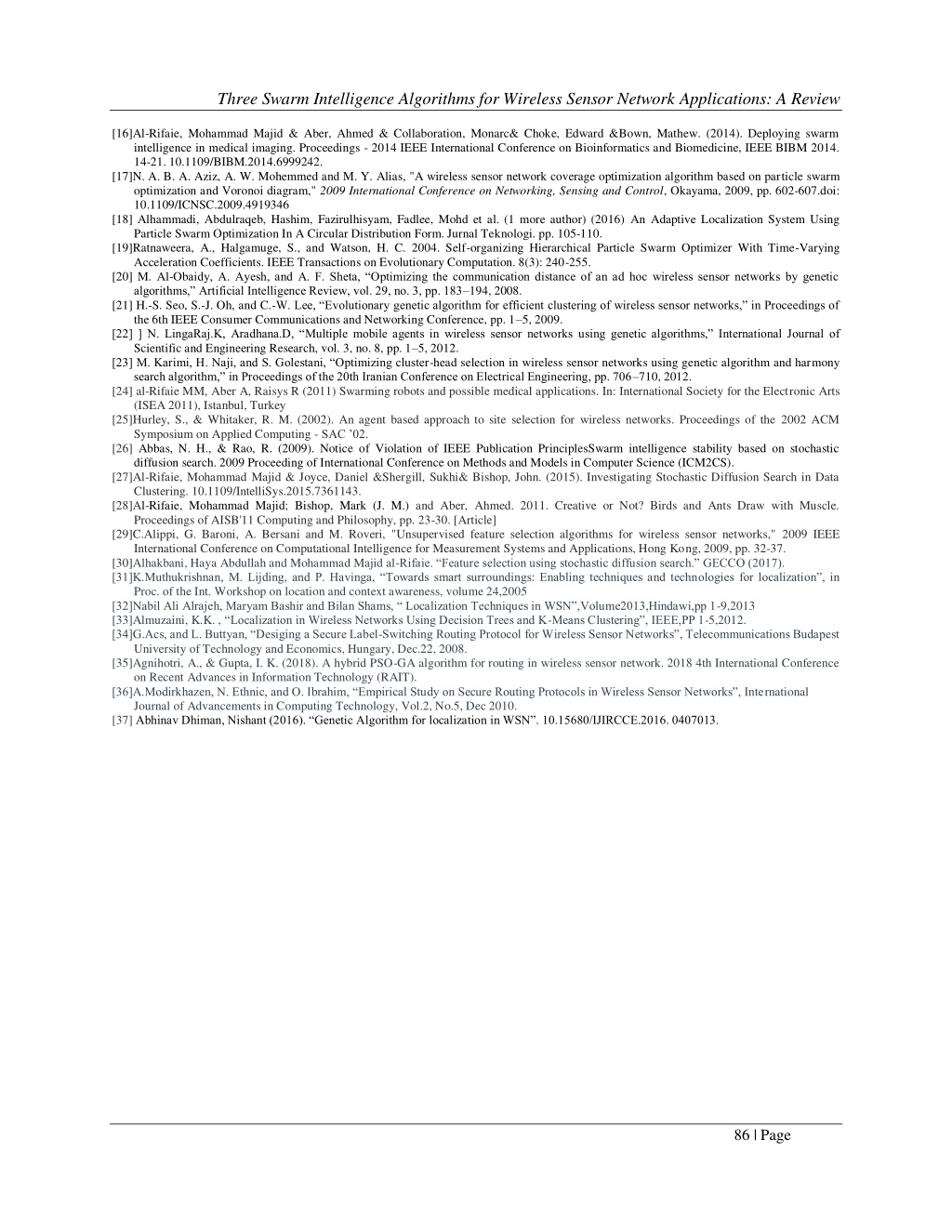 Three Swarm Intelligence Algorithms for Wireless Sensor Network Applications: A Review [16]Al-Rifaie, Mohammad Majid & Aber, Ahmed & Collaboration, Monarc& Choke, Edward &Bown, Mathew. (2014). Deploying swarm intelligence in medical imaging. Proceedings - 2014 IEEE International Conference on Bioinformatics and Biomedicine, IEEE BIBM 2014. 14-21. 10.1109/BIBM.2014.6999242. [17]N. A. B. A. Aziz, A. W. Mohemmed and M. Y. Alias, "A wireless sensor network coverage optimization algorithm based on particle swarm optimization and Voronoi diagram," 2009 International Conference on Networking, Sensing and Control, Okayama, 2009, pp. 602-607.doi: 10.1109/ICNSC.2009.4919346 [18] Alhammadi, Abdulraqeb, Hashim, Fazirulhisyam, Fadlee, Mohd et al. (1 more author) (2016) An Adaptive Localization System Using Particle Swarm Optimization In A Circular Distribution Form. Jurnal Teknologi. pp. 105-110. [19]Ratnaweera, A., Halgamuge, S., and Watson, H. C. 2004. Self-organizing Hierarchical Particle Swarm Optimizer With Time-Varying Acceleration Coefficients. IEEE Transactions on Evolutionary Computation. 8(3): 240-255. [20] M. Al-Obaidy, A. Ayesh, and A. F. Sheta, “Optimizing the communication distance of an ad hoc wireless sensor networks by genetic algorithms,” Artificial Intelligence Review, vol. 29, no. 3, pp. 183–194, 2008. [21] H.-S. Seo, S.-J. Oh, and C.-W. Lee, “Evolutionary genetic algorithm for efficient clustering of wireless sensor networks,” in Proceedings of the 6th IEEE Consumer Communications and Networking Conference, pp. 1–5, 2009. [22] ] N. LingaRaj.K, Aradhana.D, “Multiple mobile agents in wireless sensor networks using genetic algorithms,” International Journal of Scientific and Engineering Research, vol. 3, no. 8, pp. 1–5, 2012. [23] M. Karimi, H. Naji, and S. Golestani, “Optimizing cluster-head selection in wireless sensor networks using genetic algorithm and harmony search algorithm,” in Proceedings of the 20th Iranian Conference on Electrical Engineering, pp. 706–710, 2012. [24] al-Rifaie MM, Aber A, Raisys R (2011) Swarming robots and possible medical applications. In: International Society for the Electronic Arts (ISEA 2011), Istanbul, Turkey [25]Hurley, S., & Whitaker, R. M. (2002). An agent based approach to site selection for wireless networks. Proceedings of the 2002 ACM Symposium on Applied Computing - SAC ’02. [26] Abbas, N. H., & Rao, R. (2009). Notice of Violation of IEEE Publication PrinciplesSwarm intelligence stability based on stochastic diffusion search. 2009 Proceeding of International Conference on Methods and Models in Computer Science (ICM2CS). [27]Al-Rifaie, Mohammad Majid & Joyce, Daniel &Shergill, Sukhi& Bishop, John. (2015). Investigating Stochastic Diffusion Search in Data Clustering. 10.1109/IntelliSys.2015.7361143. [28]Al-Rifaie, Mohammad Majid; Bishop, Mark (J. M.) and Aber, Ahmed. 2011. Creative or Not? Birds and Ants Draw with Muscle. Proceedings of AISB'11 Computing and Philosophy, pp. 23-30. [Article] [29]C.Alippi, G. Baroni, A. Bersani and M. Roveri, "Unsupervised feature selection algorithms for wireless sensor networks," 2009 IEEE International Conference on Computational Intelligence for Measurement Systems and Applications, Hong Kong, 2009, pp. 32-37. [30]Alhakbani, Haya Abdullah and Mohammad Majid al-Rifaie. “Feature selection using stochastic diffusion search.” GECCO (2017). [31]K.Muthukrishnan, M. Lijding, and P. Havinga, “Towards smart surroundings: Enabling techniques and technologies for localization”, in Proc. of the Int. Workshop on location and context awareness, volume 24,2005 [32]Nabil Ali Alrajeh, Maryam Bashir and Bilan Shams, “ Localization Techniques in WSN”,Volume2013,Hindawi,pp 1-9,2013 [33]Almuzaini, K.K. , “Localization in Wireless Networks Using Decision Trees and K-Means Clustering”, IEEE,PP 1-5,2012. [34]G.Acs, and L. Buttyan, “Desiging a Secure Label-Switching Routing Protocol for Wireless Sensor Networks”, Telecommunications Budapest University of Technology and Economics, Hungary, Dec.22, 2008. [35]Agnihotri, A., & Gupta, I. K. (2018). A hybrid PSO-GA algorithm for routing in wireless sensor network. 2018 4th International Conference on Recent Advances in Information Technology (RAIT). [36]A.Modirkhazen, N. Ethnic, and O. Ibrahim, “Empirical Study on Secure Routing Protocols in Wireless Sensor Networks”, International Journal of Advancements in Computing Technology, Vol.2, No.5, Dec 2010. [37] Abhinav Dhiman, Nishant (2016). “Genetic Algorithm for localization in WSN”. 10.15680/IJIRCCE.2016. 0407013. 86 | Page