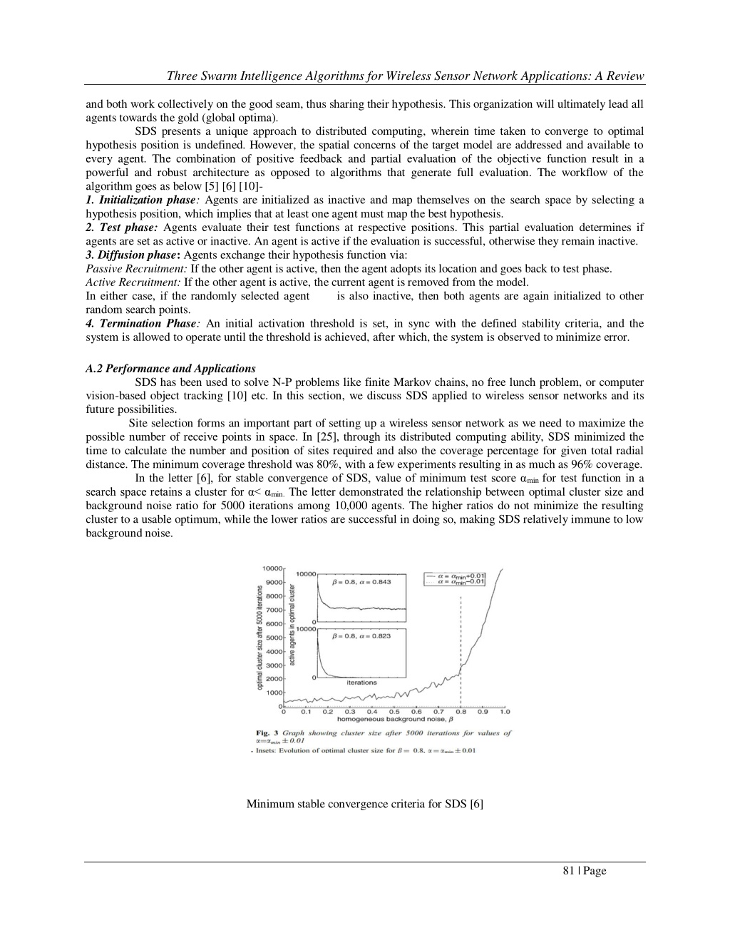 Three Swarm Intelligence Algorithms for Wireless Sensor Network Applications: A Review and both work collectively on the good seam, thus sharing their hypothesis. This organization will ultimately lead all agents towards the gold (global optima). SDS presents a unique approach to distributed computing, wherein time taken to converge to optimal hypothesis position is undefined. However, the spatial concerns of the target model are addressed and available to every agent. The combination of positive feedback and partial evaluation of the objective function result in a powerful and robust architecture as opposed to algorithms that generate full evaluation. The workflow of the algorithm goes as below [5] [6] [10]- 1. Initialization phase: Agents are initialized as inactive and map themselves on the search space by selecting a hypothesis position, which implies that at least one agent must map the best hypothesis. 2. Test phase: Agents evaluate their test functions at respective positions. This partial evaluation determines if agents are set as active or inactive. An agent is active if the evaluation is successful, otherwise they remain inactive. 3. Diffusion phase: Agents exchange their hypothesis function via: Passive Recruitment: If the other agent is active, then the agent adopts its location and goes back to test phase. Active Recruitment: If the other agent is active, the current agent is removed from the model. In either case, if the randomly selected agent is also inactive, then both agents are again initialized to other random search points. 4. Termination Phase: An initial activation threshold is set, in sync with the defined stability criteria, and the system is allowed to operate until the threshold is achieved, after which, the system is observed to minimize error. A.2 Performance and Applications SDS has been used to solve N-P problems like finite Markov chains, no free lunch problem, or computer vision-based object tracking [10] etc. In this section, we discuss SDS applied to wireless sensor networks and its future possibilities. Site selection forms an important part of setting up a wireless sensor network as we need to maximize the possible number of receive points in space. In [25], through its distributed computing ability, SDS minimized the time to calculate the number and position of sites required and also the coverage percentage for given total radial distance. The minimum coverage threshold was 80%, with a few experiments resulting in as much as 96% coverage. In the letter [6], for stable convergence of SDS, value of minimum test score αmin for test function in a search space retains a cluster for α< αmin. The letter demonstrated the relationship between optimal cluster size and background noise ratio for 5000 iterations among 10,000 agents. The higher ratios do not minimize the resulting cluster to a usable optimum, while the lower ratios are successful in doing so, making SDS relatively immune to low background noise. . Minimum stable convergence criteria for SDS [6] 81 | Page