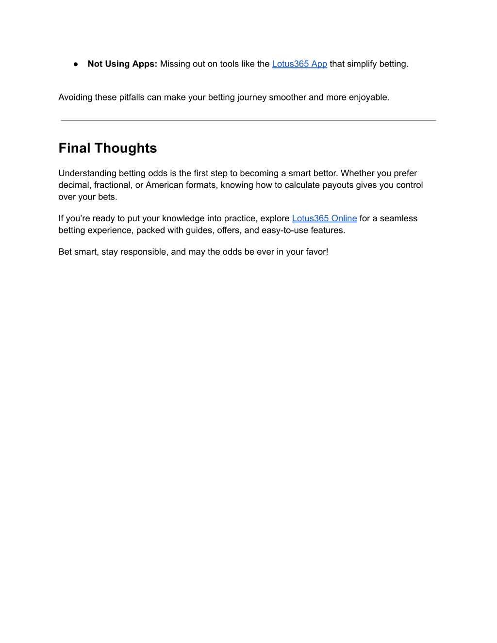 ● Not Using Apps: Missing out on tools like the Lotus365 App that simplify betting. Avoiding these pitfalls can make your betting journey smoother and more enjoyable. Final Thoughts Understanding betting odds is the first step to becoming a smart bettor. Whether you prefer decimal, fractional, or American formats, knowing how to calculate payouts gives you control over your bets. If you’re ready to put your knowledge into practice, explore Lotus365 Online for a seamless betting experience, packed with guides, offers, and easy-to-use features. Bet smart, stay responsible, and may the odds be ever in your favor!