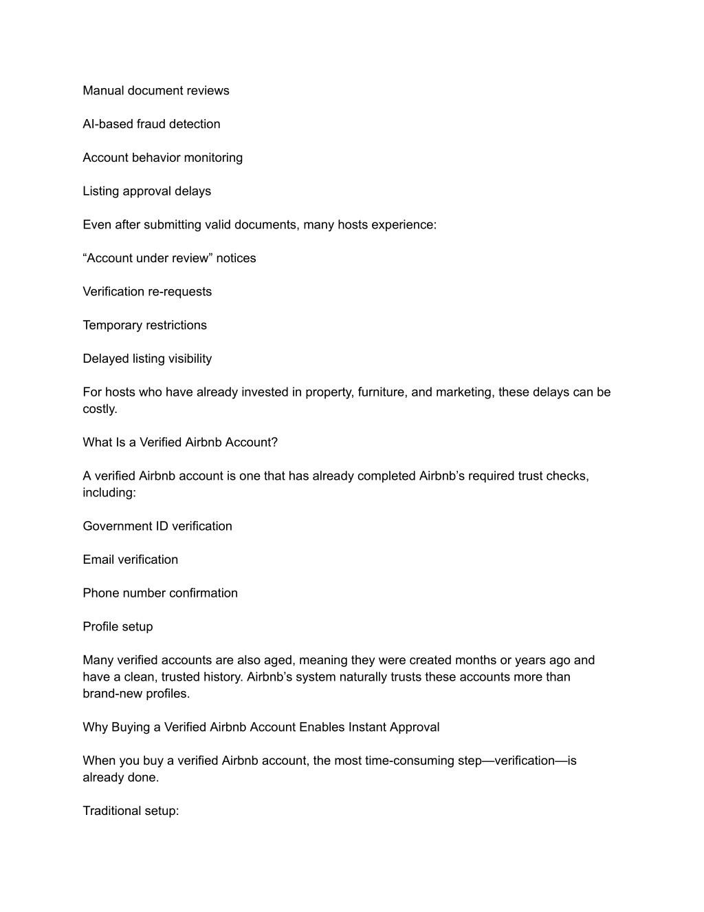 2. Manual document reviews AI-based fraud detection Account behavior monitoring Listing approval delays Even after submitting valid documents, many hosts experience: “Account under review” notices Verification re-requests Temporary restrictions Delayed listing visibility For hosts who have already invested in property, furniture, and marketing, these delays can be costly. What Is a Verified Airbnb Account? A verified Airbnb account is one that has already completed Airbnb’s required trust checks, including: Government ID verification Email verification Phone number confirmation Profile setup Many verified accounts are also aged, meaning they were created months or years ago and have a clean, trusted history. Airbnb’s system naturally trusts these accounts more than brand-new profiles. Why Buying a Verified Airbnb Account Enables Instant Approval When you buy a verified Airbnb account, the most time-consuming step—verification—is already done. Traditional setup: