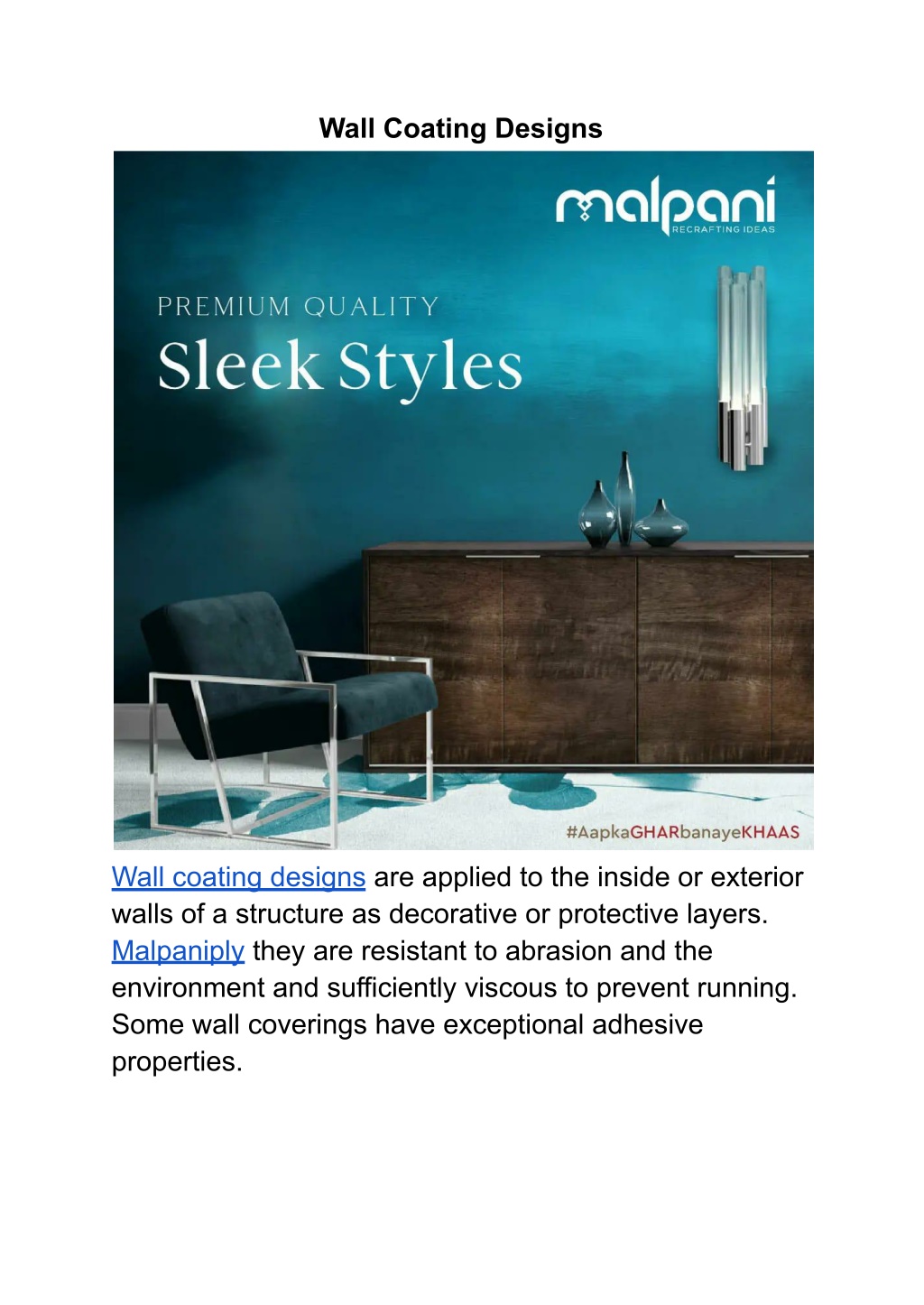 Wall Coating Designs Wall coating designs are applied to the inside or exterior walls of a structure as decorative or protective layers. Malpaniply they are resistant to abrasion and the environment and sufficiently viscous to prevent running. Some wall coverings have exceptional adhesive properties.