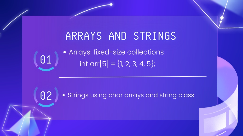 Arrays: fixed-size collections int arr[5] = {1, 2, 3, 4, 5}; Strings using char arrays and string class