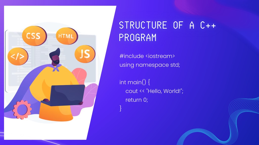 #include <iostream> using namespace std; int main() { cout << "Hello, World!"; return 0; }
