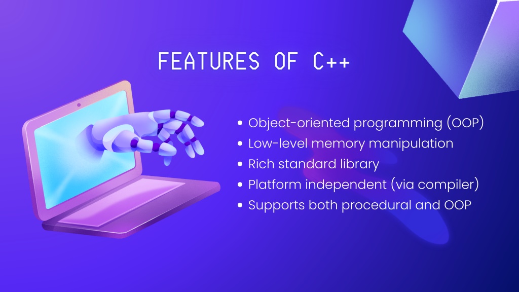 Object-oriented programming (OOP) Low-level memory manipulation Rich standard library Platform independent (via compiler) Supports both procedural and OOP