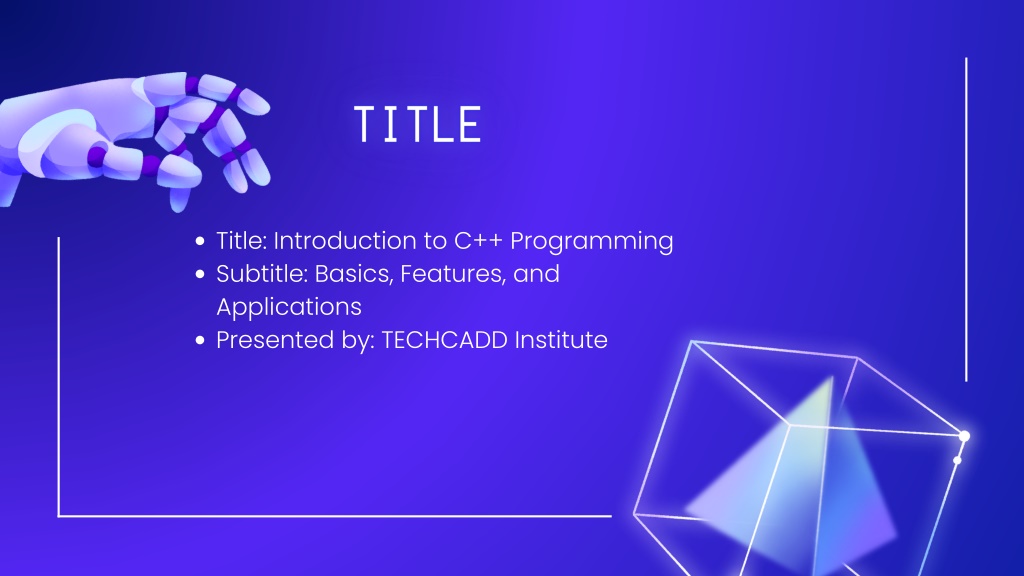 Title: Introduction to C++ Programming Subtitle: Basics, Features, and Applications Presented by: TECHCADD Institute