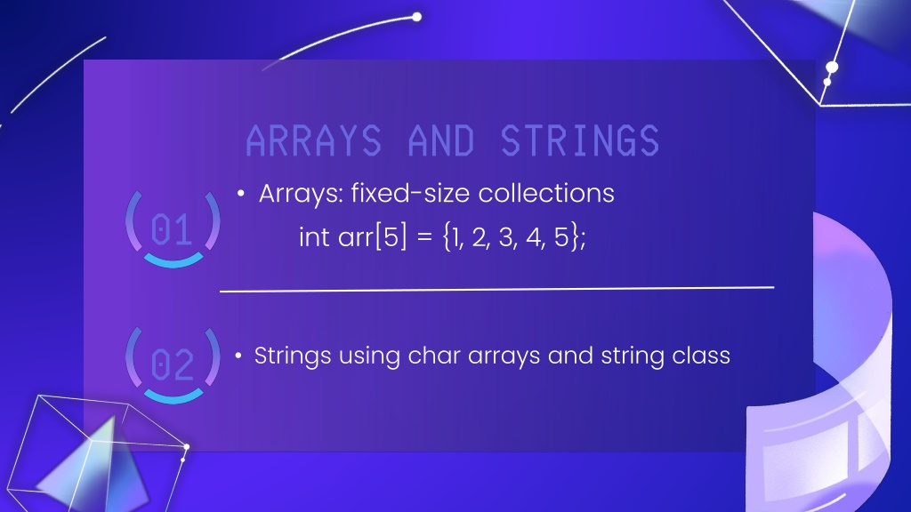 ARRAYS AND STRINGS • Arrays: fixed-size collections • 01 int arr[5] = {1, 2, 3, 4, 5}; • Strings using char arrays and string class • 02
