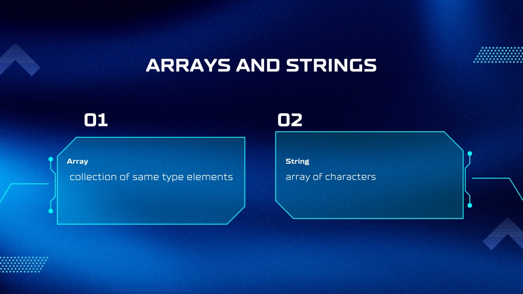 ARRAYS AND STRINGS 01 02 Array String collection of same type elements array of characters