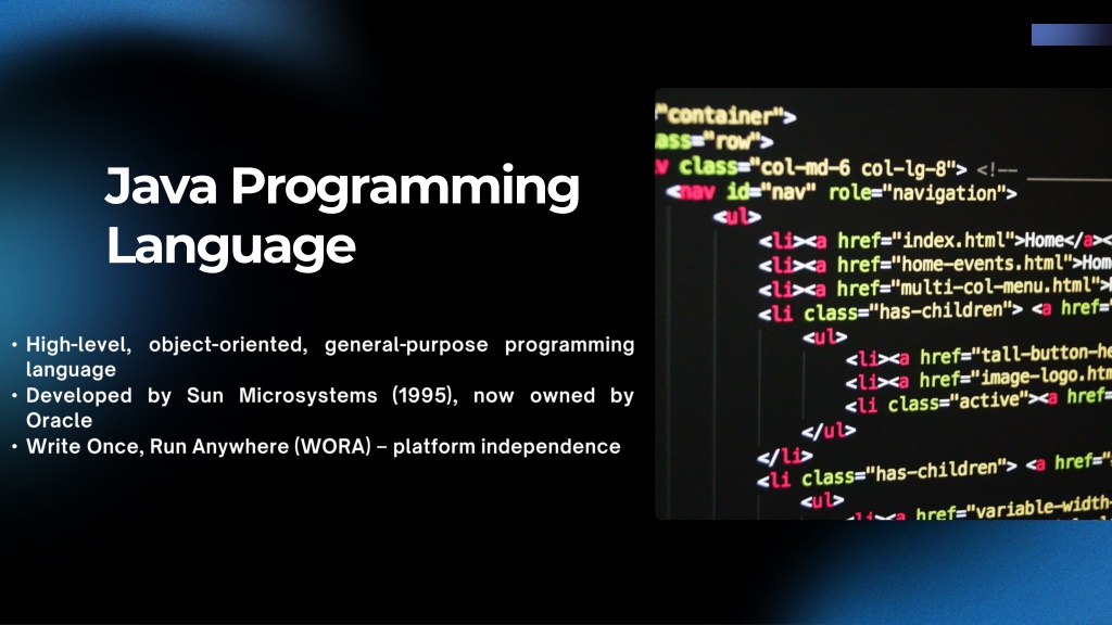 Java Programming Language • High-level, object-oriented, general-purpose programming language • Developed by Sun Microsystems (1995), now owned by Oracle • Write Once, Run Anywhere (WORA) – platform independence