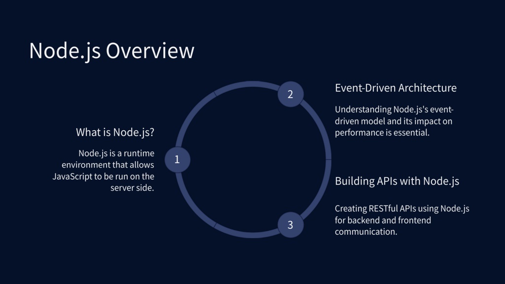 Creating RESTful APIs using Node.js for backend and frontend communication. Node.js is a runtime environment that allows JavaScript to be run on the server side. Understanding Node.js's event-driven model and its impact on performance is essential. Node.js Overview Building APIs with Node.js Event-Driven Architecture What is Node.js? 2 3 1