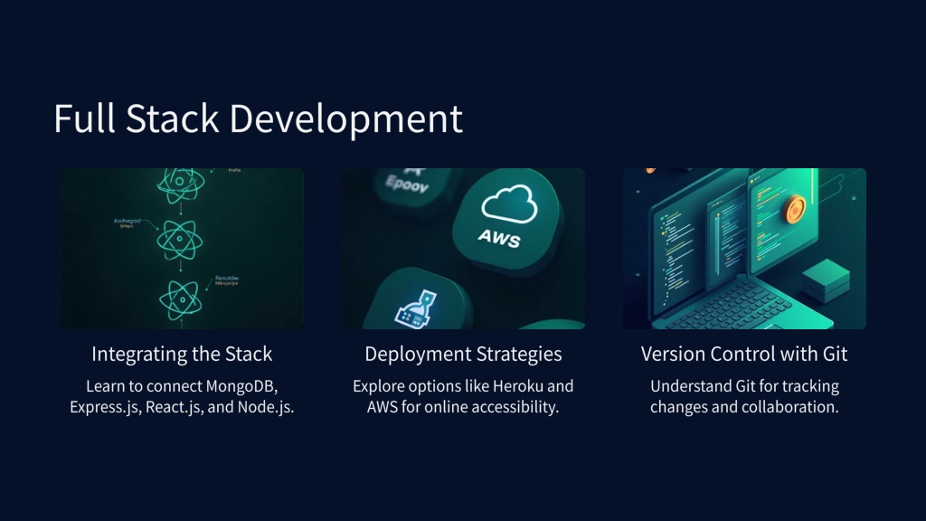 Learn to connect MongoDB, Express.js, React.js, and Node.js. Explore options like Heroku and AWS for online accessibility. Understand Git for tracking changes and collaboration. Full Stack Development Version Control with Git Deployment Strategies Integrating the Stack