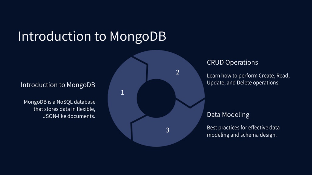 MongoDB is a NoSQL database that stores data in flexible, JSON-like documents. Learn how to perform Create, Read, Update, and Delete operations. Best practices for effective data modeling and schema design. Introduction to MongoDB Introduction to MongoDB Data Modeling CRUD Operations 3 1 2