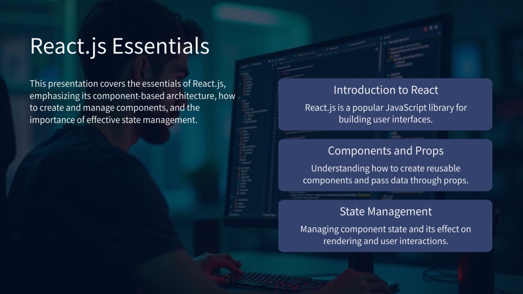 React.js is a popular JavaScript library for building user interfaces. This presentation covers the essentials of React.js, emphasizing its component-based architecture, how to create and manage components, and the importance of effective state management. Understanding how to create reusable components and pass data through props. Managing component state and its effect on rendering and user interactions. React.js Essentials Components and Props Introduction to React State Management