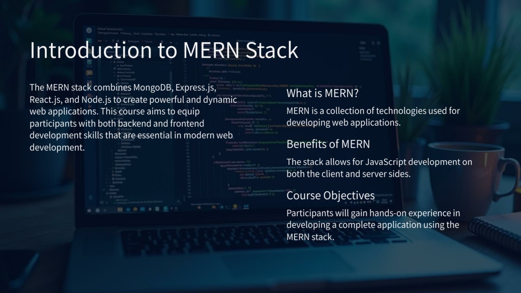 The stack allows for JavaScript development on both the client and server sides. Participants will gain hands-on experience in developing a complete application using the MERN stack. MERN is a collection of technologies used for developing web applications. The MERN stack combines MongoDB, Express.js, React.js, and Node.js to create powerful and dynamic web applications. This course aims to equip participants with both backend and frontend development skills that are essential in modern web development. Introduction to MERN Stack Course Objectives Benefits of MERN What is MERN?