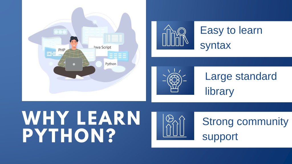 Easy to learn syntax Large standard library WHY LEARN PYTHON? Strong community support