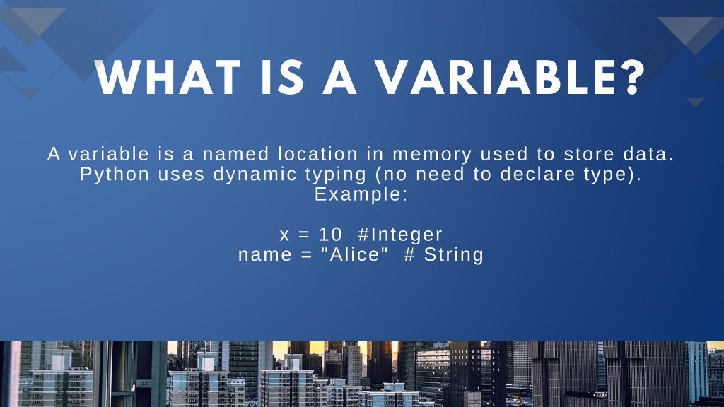 WHAT IS A VARIABLE? A variable is a named location in memory used to store data. Python uses dynamic typing (no need to declare type). Example: x = 10 #Integer name = "Alice" # String