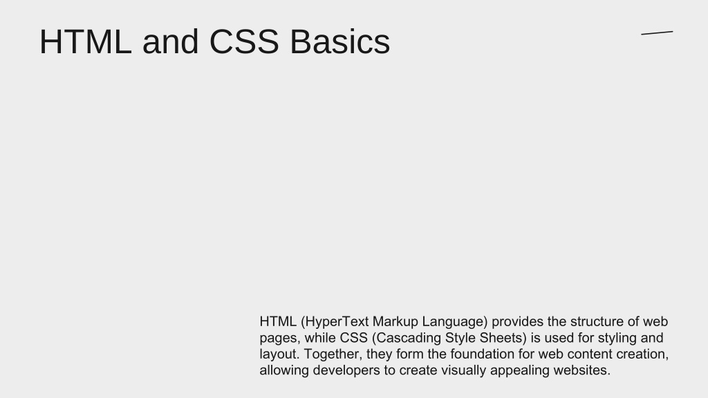 HTML and CSS Basics HTML (HyperText Markup Language) provides the structure of web pages, while CSS (Cascading Style Sheets) is used for styling and layout. Together, they form the foundation for web content creation, allowing developers to create visually appealing websites.