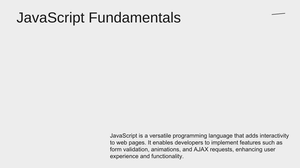 JavaScript Fundamentals JavaScript is a versatile programming language that adds interactivity to web pages. It enables developers to implement features such as form validation, animations, and AJAX requests, enhancing user experience and functionality.