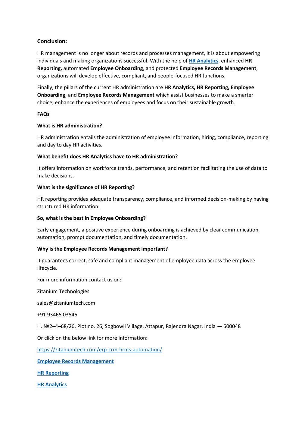 Conclusion: HR management is no longer about records and processes management, it is about empowering individuals and making organizations successful. With the help of HR Analytics, enhanced HR Reporting, automated Employee Onboarding, and protected Employee Records Management, organizations will develop effective, compliant, and people-focused HR functions. Finally, the pillars of the current HR administration are HR Analytics, HR Reporting, Employee Onboarding, and Employee Records Management which assist businesses to make a smarter choice, enhance the experiences of employees and focus on their sustainable growth. FAQs What is HR administration? HR administration entails the administration of employee information, hiring, compliance, reporting and day to day HR activities. What benefit does HR Analytics have to HR administration? It offers information on workforce trends, performance, and retention facilitating the use of data to make decisions. What is the significance of HR Reporting? HR reporting provides adequate transparency, compliance, and informed decision-making by having structured HR information. So, what is the best in Employee Onboarding? Early engagement, a positive experience during onboarding is achieved by clear communication, automation, prompt documentation, and timely documentation. Why is the Employee Records Management important? It guarantees correct, safe and compliant management of employee data across the employee lifecycle. For more information contact us on: Zitanium Technologies sales@zitaniumtech.com +91 93465 03546 H. №2–4–68/26, Plot no. 26, Sogbowli Village, Attapur, Rajendra Nagar, India — 500048 Or click on the below link for more information: https://zitaniumtech.com/erp-crm-hrms-automation/ Employee Records Management HR Reporting HR Analytics