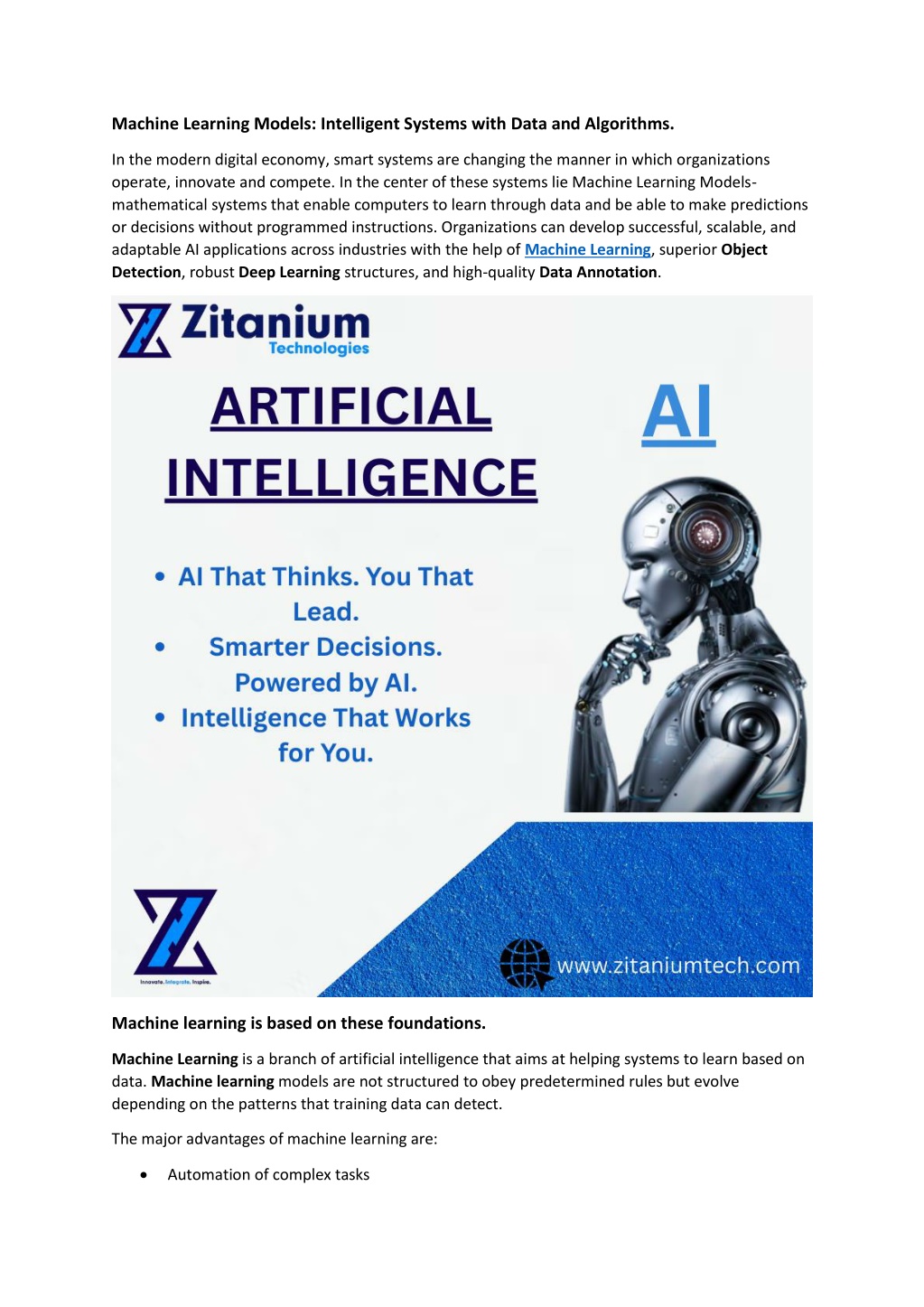 Machine Learning Models: Intelligent Systems with Data and Algorithms. In the modern digital economy, smart systems are changing the manner in which organizations operate, innovate and compete. In the center of these systems lie Machine Learning Models- mathematical systems that enable computers to learn through data and be able to make predictions or decisions without programmed instructions. Organizations can develop successful, scalable, and adaptable AI applications across industries with the help of Machine Learning, superior Object Detection, robust Deep Learning structures, and high-quality Data Annotation. Machine learning is based on these foundations. Machine Learning is a branch of artificial intelligence that aims at helping systems to learn based on data. Machine learning models are not structured to obey predetermined rules but evolve depending on the patterns that training data can detect. The major advantages of machine learning are: •Automation of complex tasks