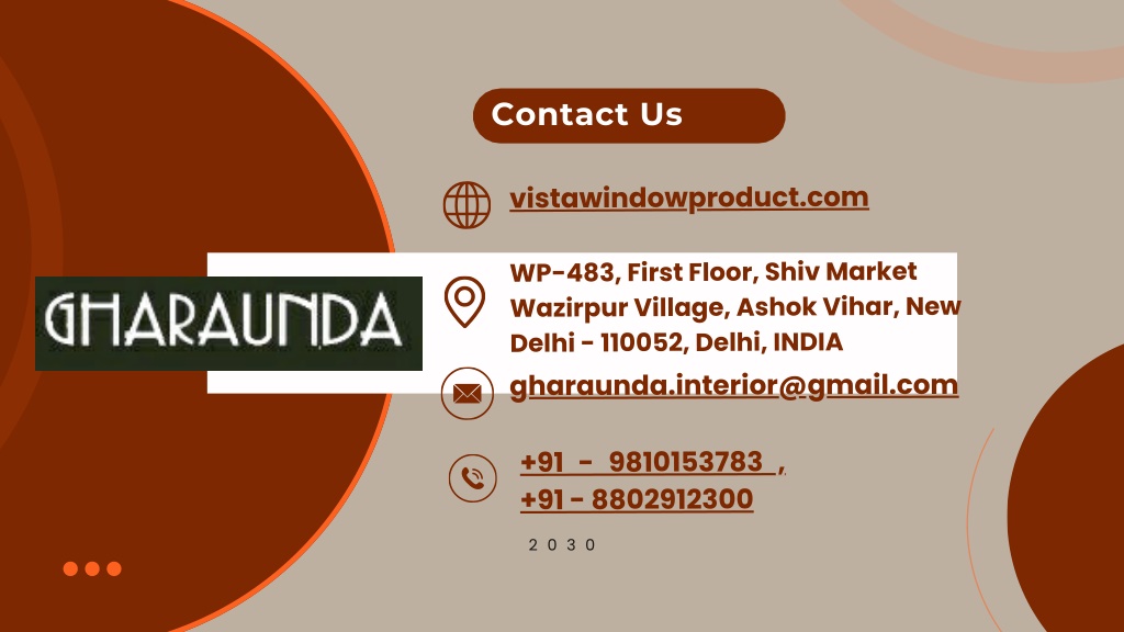 Contact Us vistawindowproduct.com WP-483, First Floor, Shiv Market Wazirpur Village, Ashok Vihar, New Delhi - 110052, Delhi, INDIA gharaunda.interior@gmail.com +91 - 9810153783 , +91 - 8802912300 2 0 3 0