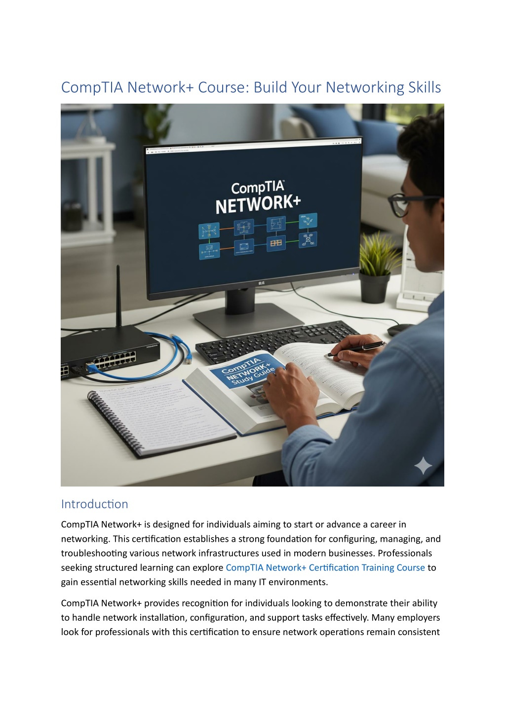 CompTIA Network+ Course: Build Your Networking Skills Introduction CompTIA Network+ is designed for individuals aiming to start or advance a career in networking. This certification establishes a strong foundation for configuring, managing, and troubleshooting various network infrastructures used in modern businesses. Professionals seeking structured learning can explore CompTIA Network+ Certification Training Course to gain essential networking skills needed in many IT environments. CompTIA Network+ provides recognition for individuals looking to demonstrate their ability to handle network installation, configuration, and support tasks effectively. Many employers look for professionals with this certification to ensure network operations remain consistent