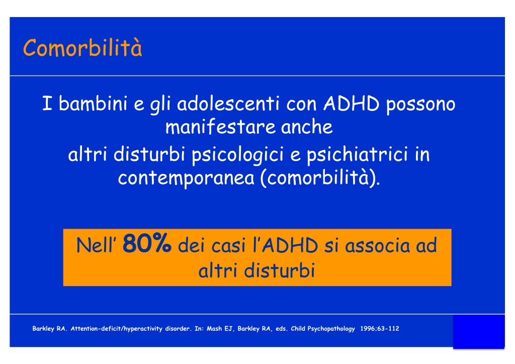 Comorbilità IbambiniegliadolescenticonADHDpossono manifestareanche altridisturbipsicologiciepsichiatriciin contemporanea(comorbilità). Nell’80%deicasil’ADHDsiassocia ad altridisturbi BarkleyRA.Attention-deficit/hyperactivitydisorder.In: MashEJ,BarkleyRA,eds.ChildPsychopathology1996;63-112