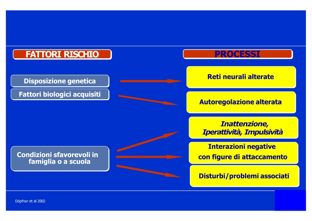 PROCESSI FATTORIRISCHIO Retineuralialterate Disposizionegenetica Fattoribiologiciacquisiti Autoregolazionealterata Inattenzione, Iperattività,Impulsività Interazioninegative configurediattaccamento Condizionisfavorevoliin famigliaoascuola Disturbi/problemiassociati Döpfneretal2002