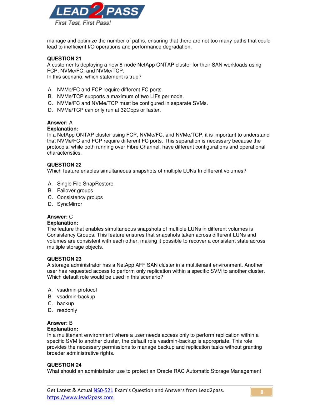 manage and optimize the number of paths, ensuring that there are not too many paths that could lead to inefficient I/O operations and performance degradation. QUESTION 21 A customer Is deploying a new 8-node NetApp ONTAP cluster for their SAN workloads using FCP, NVMe/FC, and NVMe/TCP. In this scenario, which statement is true? A. NVMe/FC and FCP require different FC ports. B. NVMe/TCP supports a maximum of two LIFs per node. C. NVMe/FC and NVMe/TCP must be configured in separate SVMs. D. NVMe/TCP can only run at 32Gbps or faster. Answer: A Explanation: In a NetApp ONTAP cluster using FCP, NVMe/FC, and NVMe/TCP, it is important to understand that NVMe/FC and FCP require different FC ports. This separation is necessary because the protocols, while both running over Fibre Channel, have different configurations and operational characteristics. QUESTION 22 Which feature enables simultaneous snapshots of multiple LUNs In different volumes? A. Single File SnapRestore B. Failover groups C. Consistency groups D. SyncMirror Answer: C Explanation: The feature that enables simultaneous snapshots of multiple LUNs in different volumes is Consistency Groups. This feature ensures that snapshots taken across different LUNs and volumes are consistent with each other, making it possible to recover a consistent state across multiple storage objects. QUESTION 23 A storage administrator has a NetApp AFF SAN cluster in a multitenant environment. Another user has requested access to perform only replication within a specific SVM to another cluster. Which default role would be used in this scenario? A. vsadmin-protocol B. vsadmin-backup C. backup D. readonly Answer: B Explanation: In a multitenant environment where a user needs access only to perform replication within a specific SVM to another cluster, the default role vsadmin-backup is appropriate. This role provides the necessary permissions to manage backup and replication tasks without granting broader administrative rights. QUESTION 24 What should an administrator use to protect an Oracle RAC Automatic Storage Management Get Latest & Actual NS0-521 Exam's Question and Answers from Lead2pass. https://www.lead2pass.com 8